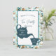 Tea party birthday theme with teapots, teacups and hummingbirds on a green and white striped background.