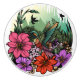 This vibrant graphic design captures the essence of springtime in a lush garden, where a delicate hummingbird flits gracefully among a tapestry of colorful flowers. The scene is bursting with life, featuring a rich palette of blooming blossoms in shades of pink, yellow, and purple, contrasted by the deep greens of flourishing trees that sway gently in the warm breeze. Sunlight filters through the leaves, casting a golden glow over the entire landscape, highlighting the iridescent feathers of the hummingbird as it hovers, poised to sip nectar from a nearby bloom. This enchanting portrayal invites viewers to immerse themselves in the beauty of nature, evoking feelings of joy, tranquility, and the wonder of the outdoors.