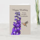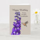 A hummingbird sipping nectar from a purple delphinium creates a beautiful greeting for a birthday.