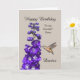 A hummingbird sipping nectar from a purple delphinium creates a beautiful greeting for a birthday. You can personalize this card with any name and occasion.