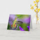 Blank greeting card featuring an allen's hummingbird flying through purple flowers with its wings and tail feathers open. Photo taken in Pasadena, California.