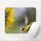 The bright yellow color of a sunflower reflects off an approaching hummingbird.