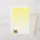This stationery features a female ruby-throated hummingbird. She hovers in the air while drinking nectar from the golden center of a bright red zinnia flower. A yellow zinnia blossom is nearby and a few green leaves complete the composition. The colors seem to glow against the yellow gradient background.