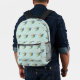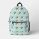 Cute backpack featuring a golden-tailed sapphire hummingbird pattern on a light blue background.