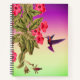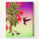A hummingbird sips nectar from bright red flowers, against a purple to green gradient background, on this spiral notebook. Perfect for home, office or school.