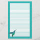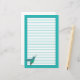 A lined stationery paper decorated with a hummingbird drawn with ink and painted in shades of emerald green and blue watercolor with a teal blue border. Great for letter writing, reminders, journaling, and more.