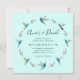 This elegant wedding invitation is featuring a watercolor wreath of hummingbirds and botanical branches on a light turquoise background. It can be customized for any other celebration, such as an anniversary, birthday party, an engagement party, retirement, or graduation. The font size and font style can be changed by clicking on "Edit using design tool". All hummingbird images are taken from original watercolors by C. Dobbins.