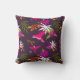 Pretty Hummingbird Tropical Flower Print Throw Pillow. Beautiful graphic print of pink and purple Hummingbirds flying and feeding in the tropical flowers and palm leaves. On a dark purple background. Ideal for brightening up a plain room. Other colours available in my store.