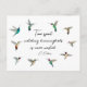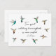 Unique post card for hummingbird lovers featuring hummingbirds of North America in flight, such such as Anna's hummingbirds, Allen's, Calliope, Rufous, Mexican Violetear and Broad-tailed hummingbirds and the sentence "Time spent watching hummingbirds is never wasted".