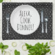 Alexa electronic device command for cooking dinner with silverware setting and round white plate on black background with white dots.