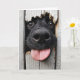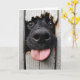 Close-up of a dog's nose and pink tongue are poking through a jagged hole in a rustic wooden fence for getting older birthday.