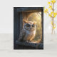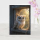 An owl wearing glasses sits perched in a wooden window frame, surrounded by a glowing sunlit background.