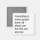 “Friendship is when people know all about you but like you anyway.” Humorous and quite true!