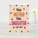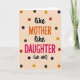 Designed with a soft peach background, this card centers a funny message that reads “like MOTHER like DAUGHTER (uh oh!)” with an affectionate, knowing tone ❤️. The small words “like” at the top and again before “DAUGHTER,” along with “(uh oh!),” appear in smooth black lettering that feels a bit like a gentle wink between close family. “MOTHER” sits in the middle in large uppercase letters colored warm orange, drawing the eye first like a proud headline. Below it, “DAUGHTER” is also in big uppercase letters, this time in bright magenta, suggesting a lively match and a shared spark. The text stays centered and stacked, giving the layout a neat rhythm that makes the joke land clearly. Around the wording, scattered polka dots in earthy red, deep green, golden yellow, rich blue, and bright orange add motion, like little confetti celebrating their bond 🌼. The dots vary slightly in spacing and placement, floating across the peach field from edge to edge.