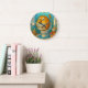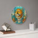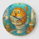 Whimsical artwork of a pufferfish reading a newspaper in a bubbling underwater bathroom, surrounded by aquatic creatures and decor, featured on a creative clock design, perfect for unique decor enthusiasts.