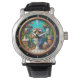 This image is a circular WATCH with a black rim and white numbers, featuring a whimsical illustration of a shocked-looking orange pufferfish wearing snorkeling goggles and reading a newspaper. while sitting on a toilet. The scene is set underwater with blue tiled walls, seaweed, starfish, and a seahorse. Bubbles float around the quirky character, all enclosed within a golden inner frame.