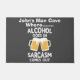 Add humor to your drinks with this humorous white text man cave sarcasm design featuring the phrase "Alcohol Goes In Sarcasm Comes Out." The bold white text brings a witty vibe for adults to enjoy. Perfect for social gatherings or enhancing your decor with a personal touch.