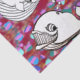 cartoon drawing of two happy humpback whales swimming on a red and blue background