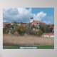 Standing in a field in the Hungarian countryside, looking at the steeples and buildings of a town. Clouds are in the blue sky, but the weather remains sunny and warm.