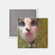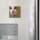 A cute blue-eyed cat staring at you from your fridge door, begging for some food...