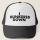 Let everyone know you hunkered down (either weather related like a storm or a bad situation) with this hat that says "I Hunkered Down" in black text