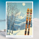 Hello from the snowy mountains of Hunter Mountain, New York, USA! We hope you're having a wonderful ski vacation. This postcard features a gorgeous blue-grey mountain landscape with retro ski boards in an orange tribal pattern.