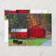 Horses graze in front of bright red barn. Fall colors are in the background.