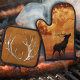 Kitchen mitts and pot holder with hunter theme. The mitt has an image of an elk, or deer, in the woods with a rusty orange background. The pot holder has antlers with animal background.