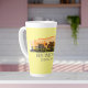 Stylish latte mug features Huntington Beach, CA city silhouette with latitude and longitude coordinates and an orange sunset watercolor wash on yellow background.
