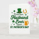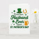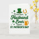 This card shows a festive St. Patrick’s Day layout on a white background, centered around the message “to the best Husband Ever HAPPY ST. PATRICK’S DAY” in mixed lettering. “to the best” sits above in smaller dark-green text, while “Husband Ever” stretches across the middle in large flowing green letters that feel like a warm, close embrace 💚. “HAPPY ST. PATRICK’S DAY” appears beneath in uppercase green, giving the greeting a strong, celebratory base. Above the words, a green leprechaun hat with a gold buckle tilts slightly, like it’s been set there with a fond, teasing touch. To the right, a gold horseshoe adds a lucky accent, and scattered dark-green shamrocks and tiny starburst marks sprinkle the space like confetti ☘️. In the lower right corner, an amber beer mug overflows with thick white foam, with more shamrocks floating around it.
