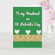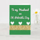 This greeting card features the line “To my Husband on St. Patrick’s Day” centered near the top in flowing white lettering against a deep emerald green background with a soft, fabric-like texture. The rich green field sets a cozy, close-to-the-heart mood, like a quiet toast shared between two people. Just below the words, a wide horizontal stripe of shimmering gold runs across the card, catching the light like a lucky find. Above that gold band, three small white hearts sit in a neat row, their simple shapes suggesting steady affection and an easy, familiar bond 💚. The color pairing of emerald, white, and gold keeps the look festive while still feeling intimate ☘️. The text stays in the upper section while the gold stripe neatly divides the layout, leaving the lower portion open and uncluttered. Three crisp white hearts are arranged evenly above the glittering gold band on the textured green field.