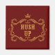 Funny kitchen magnet for country folks features gold "hush up" text and fancy frame on dark red background.