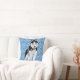This unusual cushion, features my painting of a black and white Husky against a backdrop of light blue snow flakes on a blue background. This throw pillow would make a lovely gift or a strikingly addition to any room.