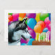 Black and white Siberian Husky looks hungrily at the chocolate birthday cake and lit candles with a background full of balloons dog lovers birthday postcard
