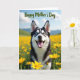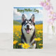This card shows a black-and-white husky-type dog framed close in the foreground, standing in a wide field of sunlit yellow, daisy-like flowers 🌼. The dog looks straight out with bright blue eyes and a relaxed, open-mouthed grin, its pink tongue showing in a way that feels like a friendly greeting ❤️. Soft daylight warms the scene, making the yellow blooms glow against the green ground as the flowers blur gently farther back. Rolling green hills stretch along the horizon under a pale blue sky with scattered white clouds, giving the setting an open, airy feel. Across the upper sky, the text “Happy Mother’s Day” sits prominently in green lettering, centered and easy to read against the light blue background. The message floats above the landscape like a note shared between close friends, while the dog’s cheerful expression adds a tender, welcoming tone. In the distance, the hills fade slightly as the flower field continues toward the horizon beneath the cloud-dotted sky.