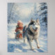 A Husky Dog is pulling a happy and smiling child on a sled trough snowy landscape.