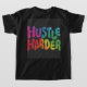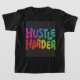 The t-shirt features the text "Hustle Harder" in a playful, bubble-letter style with a rainbow color gradient. The design is vibrant and eye-catching, with a touch of whimsy.