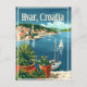 A captivating and nostalgic depiction of Hvar, Croatia, known for its stunning Adriatic coastline, vibrant nightlife, and historical charm. The design captures the island's crystal-clear turquoise waters, picturesque harbor, and ancient stone buildings nestled along the shoreline. Rendered in a vintage style, the artwork evokes the serene beauty and lively atmosphere of Hvar, inviting viewers to explore its enchanting landscapes and rich cultural heritage.