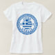 Hydra, Greece women's T-shirt featuring the National Flag Of Greece inside an Ancient Greek pattern circle symbol. Enjoy wearing this T-shirt while you're on vacation on the beautiful Hydra island or give it as a gift souvenir.