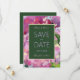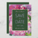 An impressionistic floral painting creates a pink and purple background for this save the date card.