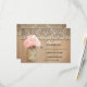 Rustic old wood background, vintage ivory lace and cute mason jar with pink hydrangea blossom hanging on the little rope - perfect wedding RSVP cards for country wedding theme with mason jars.