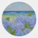 This sticker features blue hydrangeas and a picket fence by the sea and was painted by Brendan Loughlin , an artist from Guilford, Connecticut.