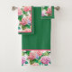 Beautiful pink and blue hydrangeas bordered with hot pink and green, this bathroom towel set is a perfect accent to your home decor.