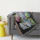 If you love hydrangeas, you'll certainly enjoy the lovely floral art on this throw. Blooming hydrangeas are shown in delightful shades from pink to blue to lavender. Background is black but may be changed by customizing.