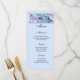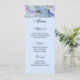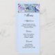 Menu Card is shown on basic white paper with a light blue background color with a colorful hydrangeas print. Script and standard text in light Black.