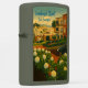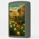 The lighter is finished in a muted olive-green matte, and on its front face is a richly colored, vintage-poster–style illustration of San Francisco’s famous Lombard Street. In the foreground, lush clusters of white and pale-yellow hydrangeas spill over brick-paved curves. Behind them, a dark-green compact car navigates the street’s switchbacks, which wind down past manicured hedges and terraced gardens. Flanking the road are pastel-toned rowhouses with wrought-iron balconies and arched doorways. A lone palm tree rises mid-scene, and beyond the houses you can make out the city’s rolling hills. In the distance, Coit Tower stands sentinel atop Telegraph Hill, and faintly on the horizon you can just discern the towers of the Golden Gate Bridge under a soft, golden sky. Across the top, in flowing script, it reads: