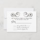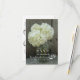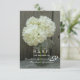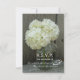 A wedding rsvp featuring a photo of a jar of white hydrangeas over a backdrop of barnwood on front. White text. Opposite side features dark gray text. Look for matching invitations at Jill's Paperie.