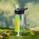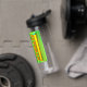 A colorful reminder to hydrate on a water bottle.