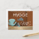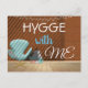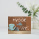 HYGGE with ME Cozy Zen Invitation Postcard . Hygge comes from the old Norse hyggja which is a content, comfortable, cozy state of mind. HYGGE with Me Typography on a blue and brown cozy room with a blue chair and blanket.