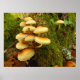 Hypholoma fasciculare mushroom (aka sulfur tuft, sulfur tuft or clustered woodlover) growing through the moss on a tree trunk